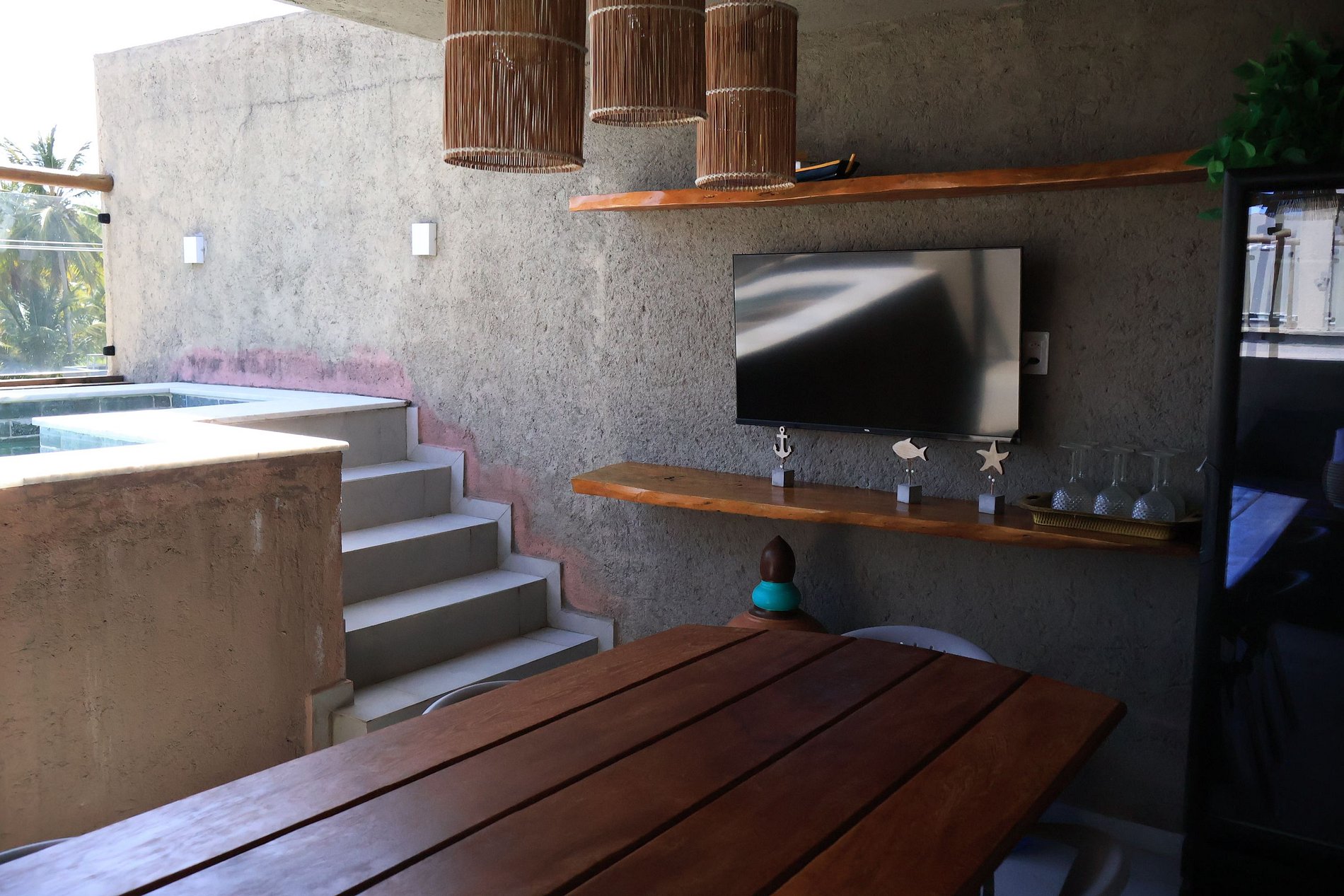 Exclusive rooftop with a dining table for 6 people, 55” TV, freezer and barbecue grill — perfect for leisure and socializing.