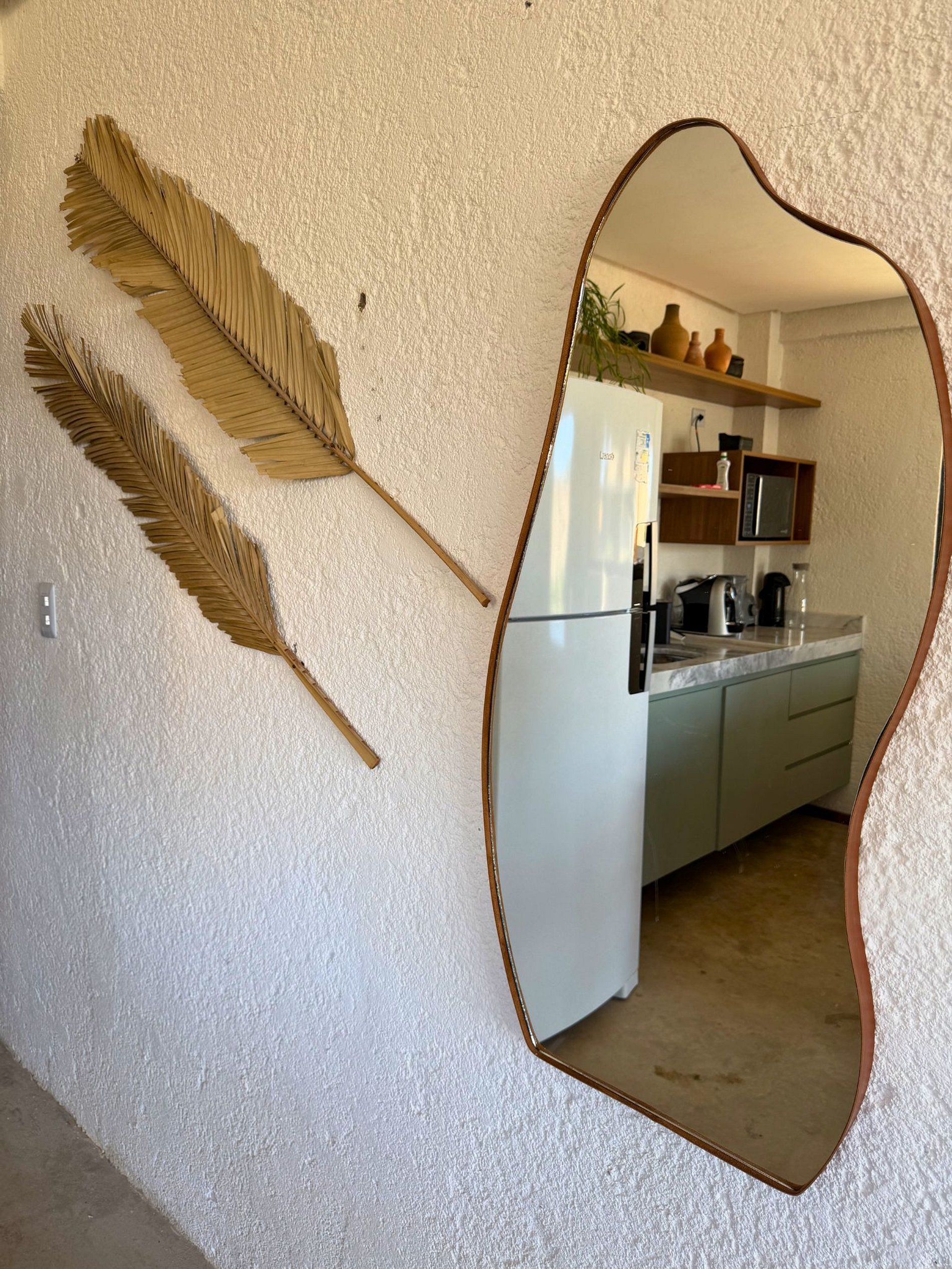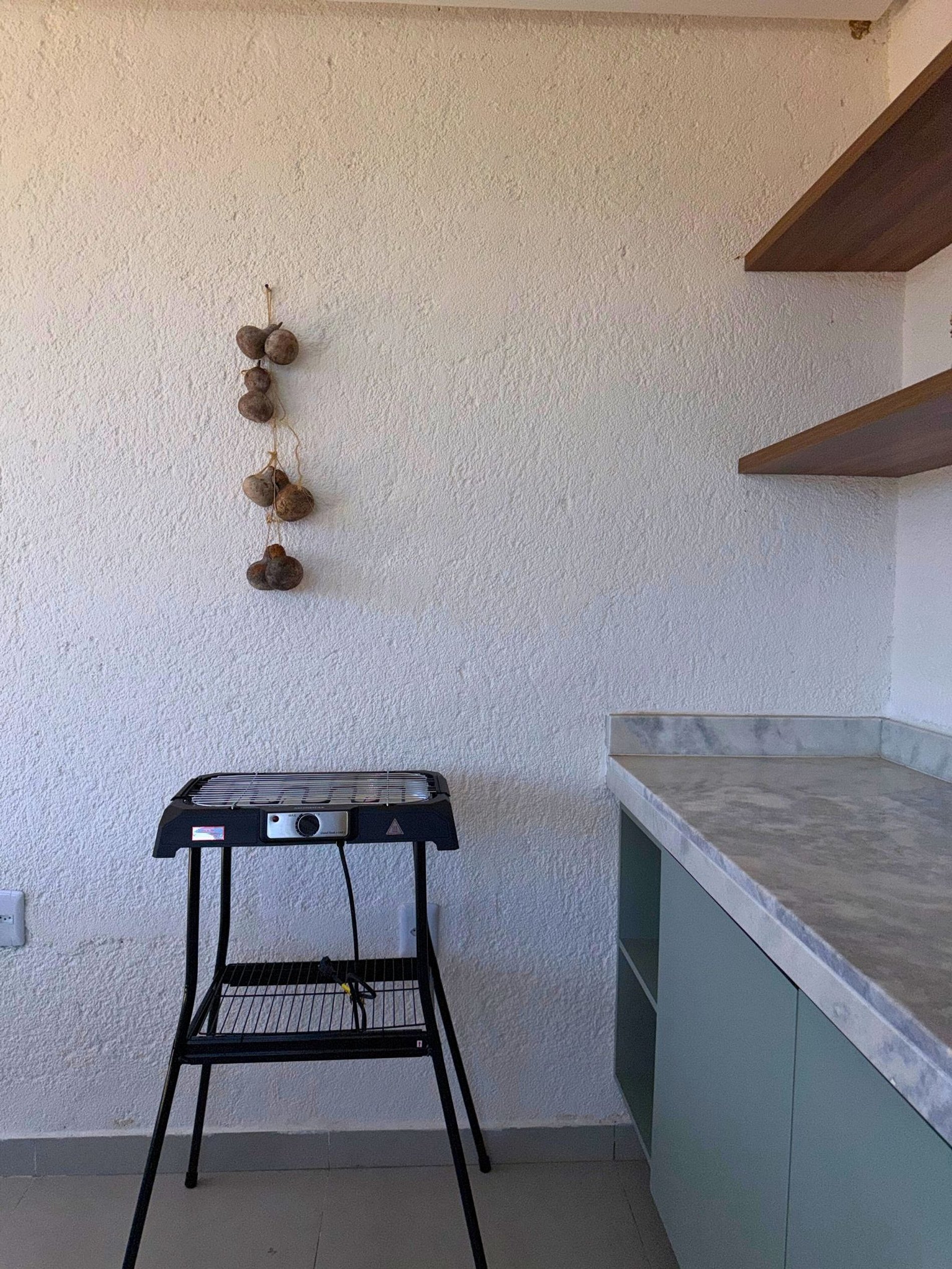 The social area is integrated, in an American style, uniting the living room and kitchen in a practical and cozy way. The kitchen is fully equipped with a refrigerator, cooktop, microwave, oven, coffee maker, sandwich maker, blender, and an elegant island counter with 6 chairs, ideal for group meals.