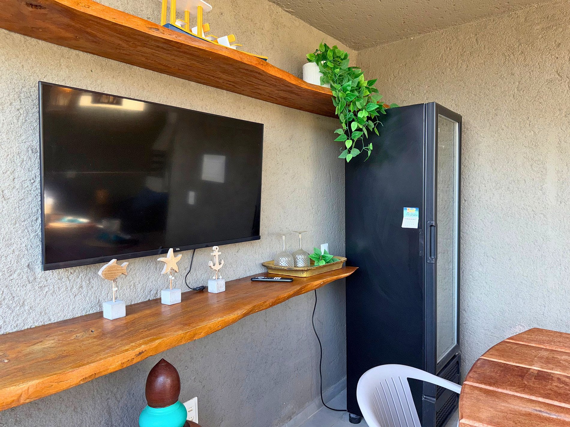 Azotea exclusiva con mesa de comedor para 6 personas, TV de 55 pulgadas, congelador y parrilla, ideal para el ocio y la socialización.
