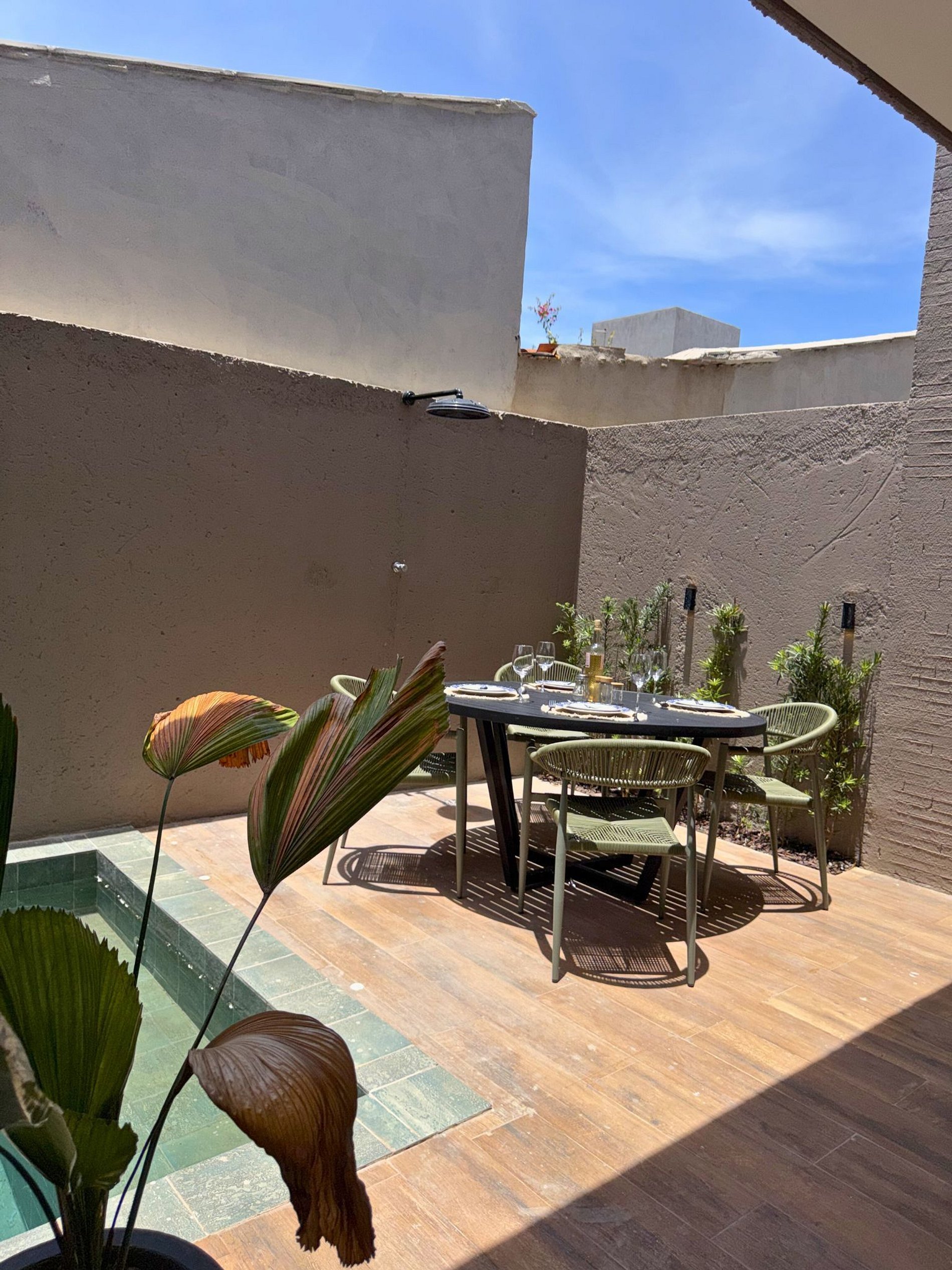 En la segunda planta, la azotea ofrece un ambiente encantador con una mesa de comedor y vistas parciales a la playa, ideal para un desayuno tranquilo o una cena.