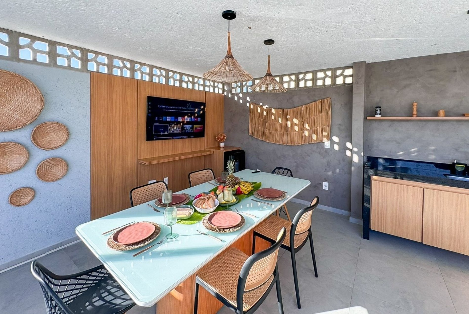 Hébergement 3 chambres, dont 1 suite, toutes climatisées : Suite : lit queen-size, TV 42" et salle de bain privative Chambre 1 : lit double et TV 32" Chambre 2 : deux lits simples et TV 32" 3 salles de bain spacieuses et bien équipées Espaces intérieurs Salon confortable avec canapé 4 places, TV 65" et table à manger 6 places Cuisine entièrement équipée avec : Plaque de cuisson 4 feux Réfrigérateur Micro-ondes Friteuse à air chaud Cafetière, appareil à sandwichs et purificateur d'eau Tous les ustensiles nécessaires pour préparer vos repas confortablement Toit-terrasse – Le point fort de Casa Lanai 30 Profitez pleinement de la maison sur le toit-terrasse exclusif, avec : Piscine privée et vue mer partielle Refroidisseur de bières et barbecue Table à manger 8 places TV 55" Douche extérieure et canapé lounge pour des moments de détente Appartement entièrement équipé avec : Espace hamac, parking à vélos Aire de jeux, laverie, portail de sécurité avec vidéosurveillance. Situation : La Casa Lanai 30 est située dans l’un des quartiers les plus prisés de la côte d’Alagoas, à proximité des principales attractions de São Miguel dos Milagres et avec un accès facile à la plage ainsi qu’aux meilleurs restaurants et bars de la région. Idéal pour les familles, les couples ou les groupes d’amis en quête de confort, d’intimité et d’une expérience inoubliable dans l’une des destinations les plus paradisiaques du Brésil.