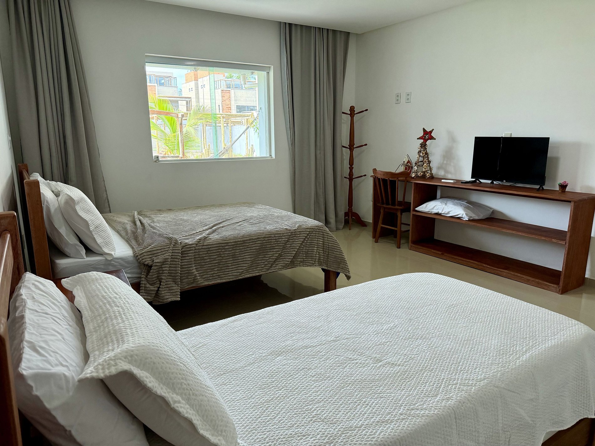 A Casa Flora conta com 3 suítes climatizadas, sendo 1 no térreo e 2 no primeiro andar, todas com vista para a piscina e o jardim.