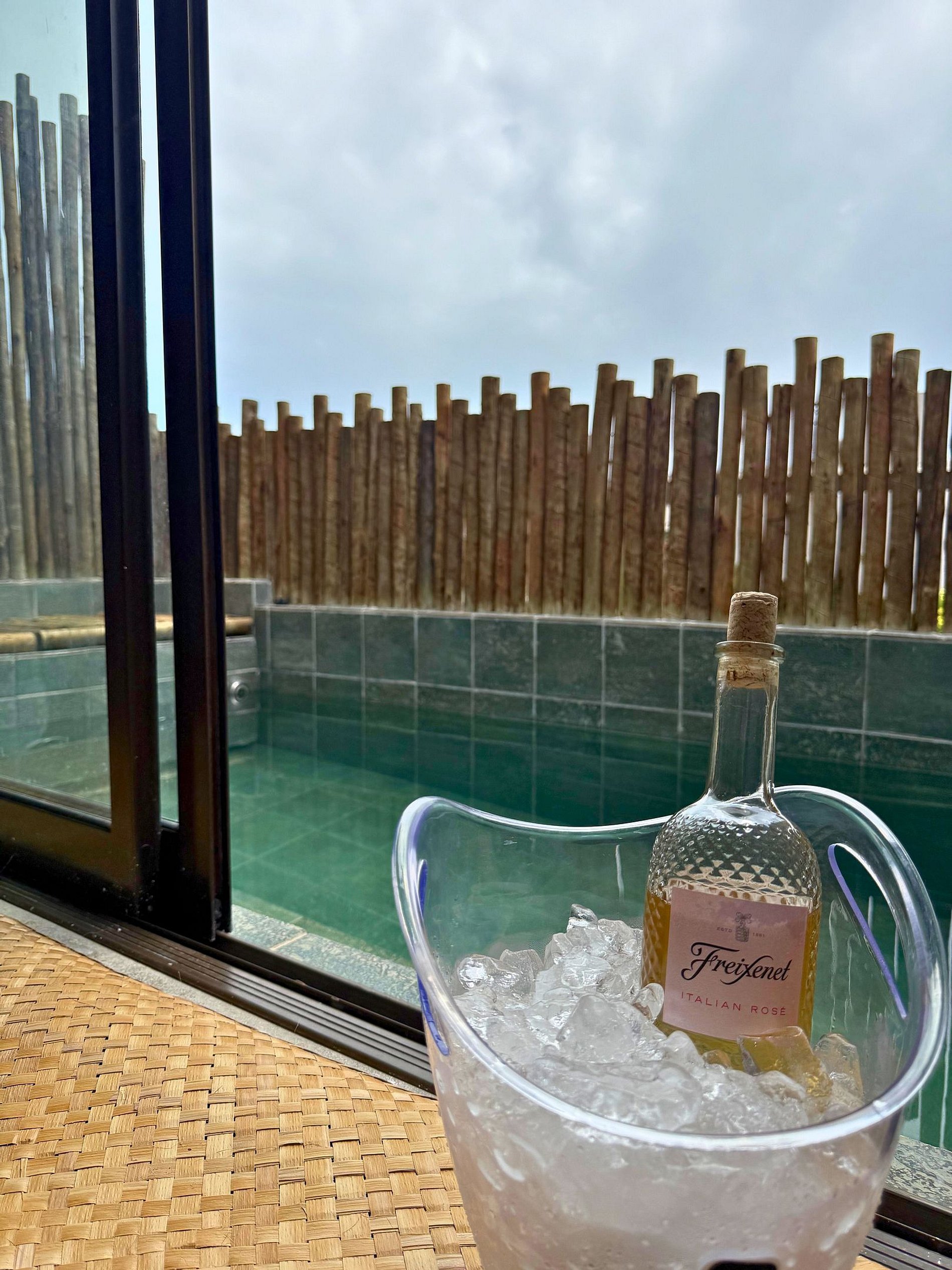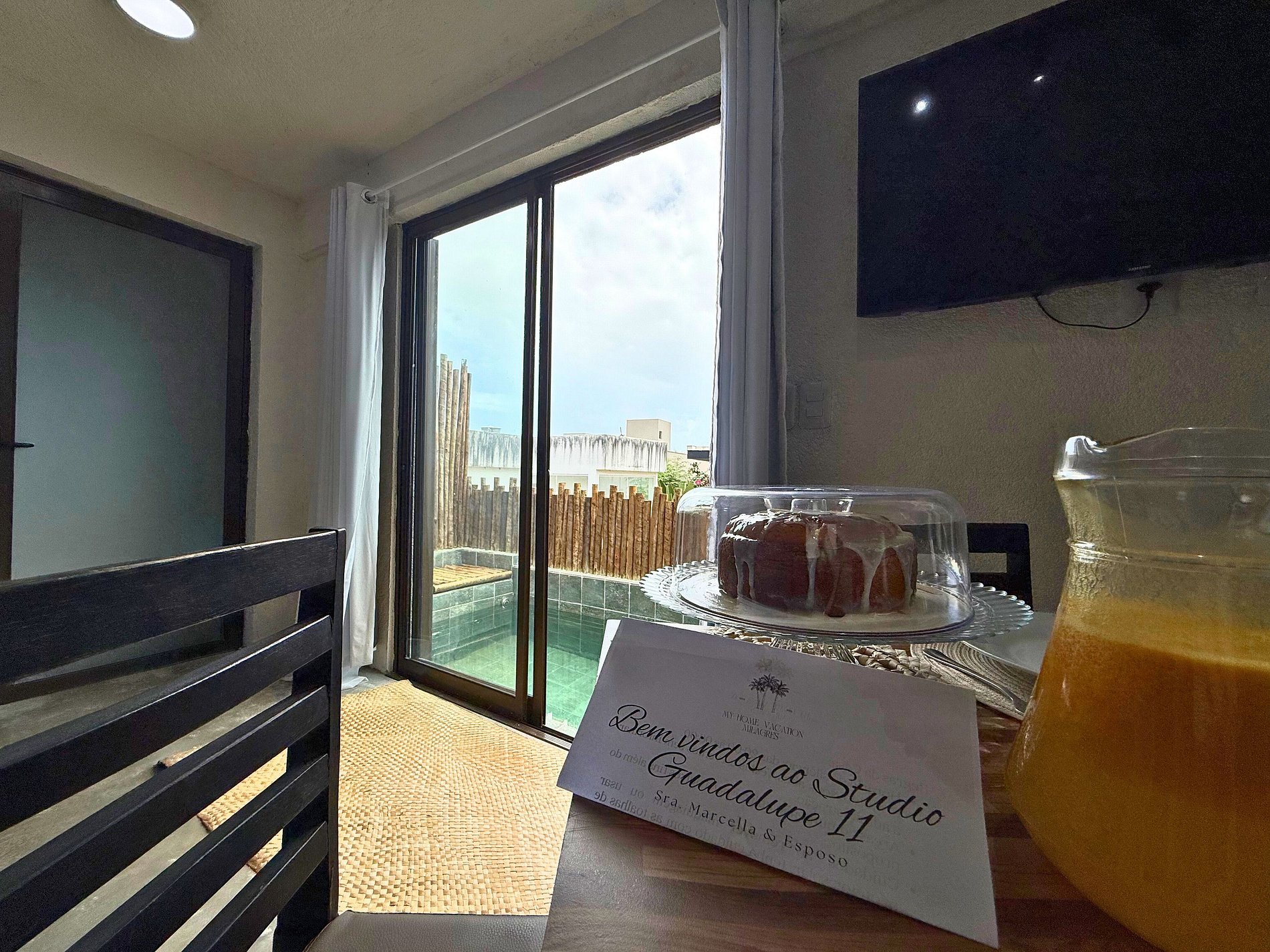 O estúdio conta com piscina privativa e vista parcial para o mar, garantindo momentos de relaxamento e tranquilidade.