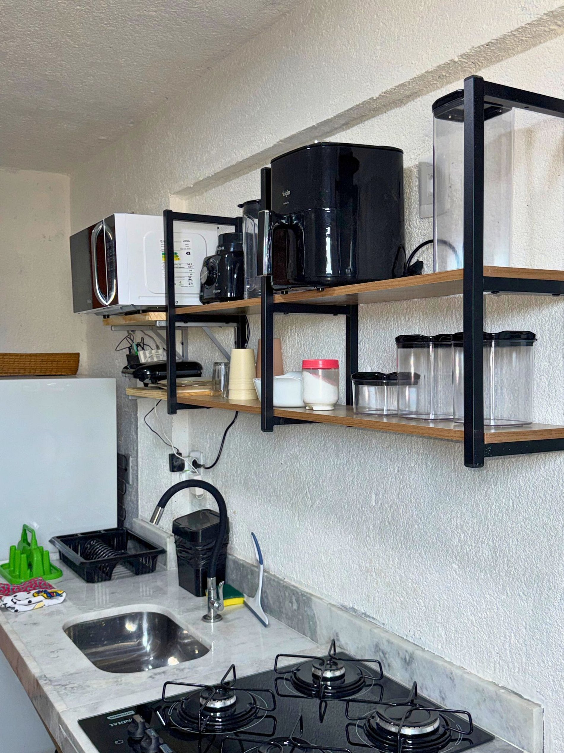 Cozinha equipada com cooktop 4 bocas, geladeira e sanduicheira