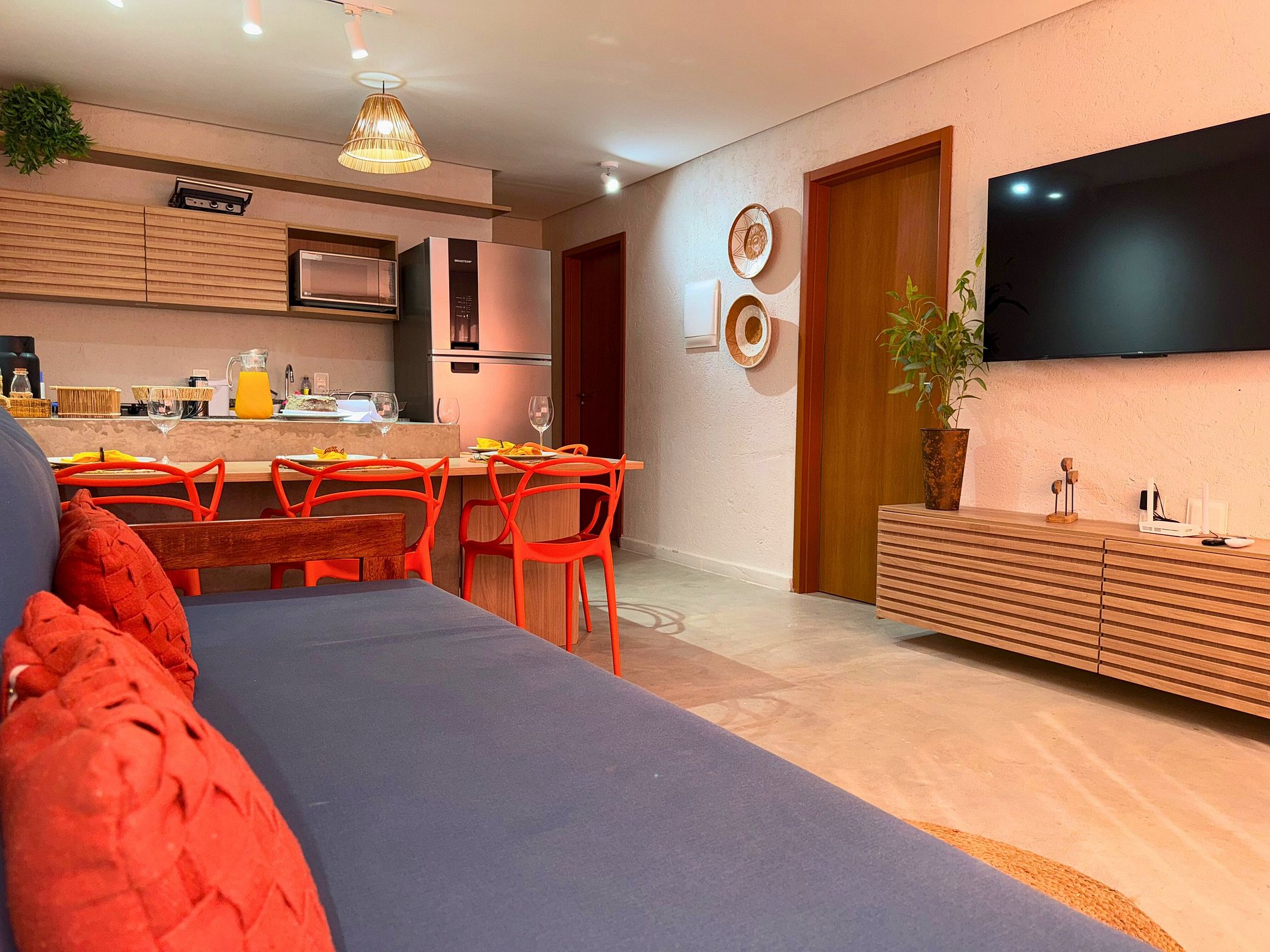 Sala climatizada com sofá-cama para duas pessoas e TV 55”.