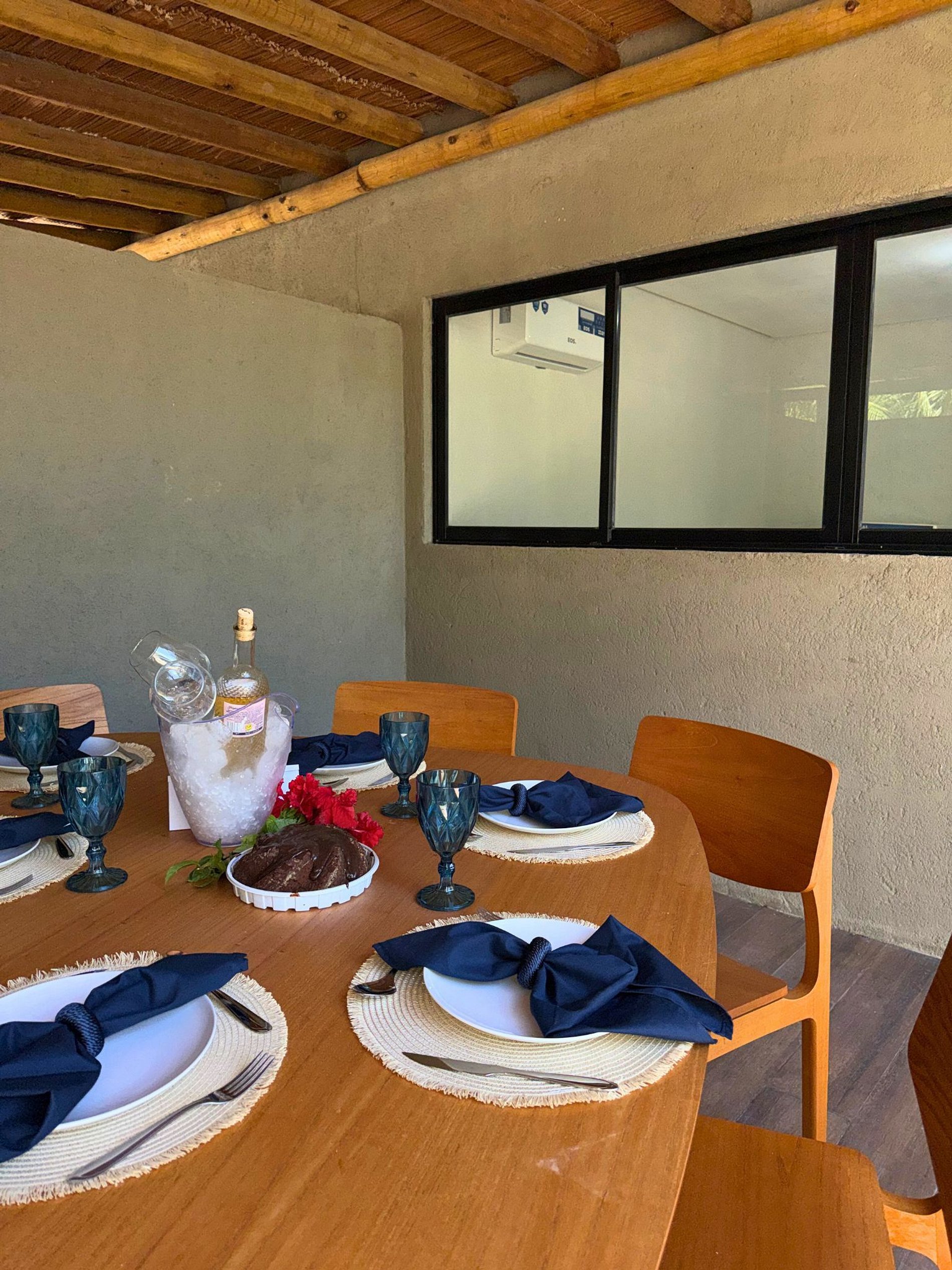 Ampla área de lazer com mesa de jantar